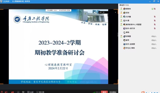 为进一步加强心理健康教育课程建设,落实《重庆工程学院全面提高教育教学质量与管理水平工作行动方案》(渝工程院〔2021〕20号),加强教师教学能力培养,切实提升教师教育教学水平和人才培养质量,将学校“四位一体”心理健康工作方案落到实处,2024年2月22日下午2:00,心理健康教育教研室通过线上线下举行了2023-2024-2学期期初教学研讨会,会议由张琼老师主持。