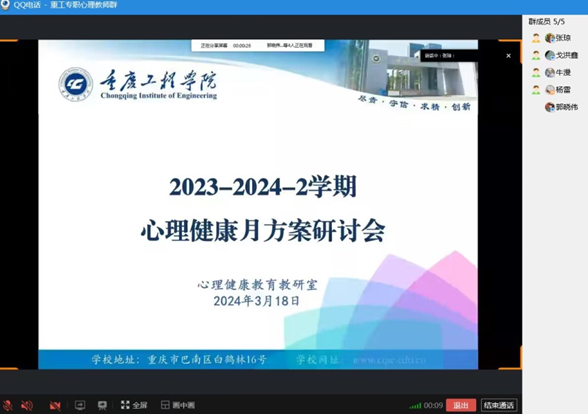 为响应五育并举,坚持以德育心、以智慧心、以体强心、以美润心、以劳健心,在全国大学生心理健康日来临之际广泛宣传与普及心理健康知识,培育学生积极心理品质,促进学生健康成长成才,按照学校《心理健康教育“四位一体”工作方案》工作要求,心理健康教育教研室于2024年3月18日通过线上线下连线两校区专职心理老师就开展校级系列心理健康主题活动方案进行了研讨。