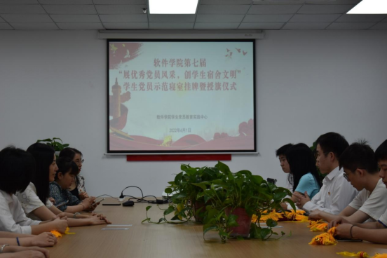 本网讯(文/徐高峰 图/孙必洪)为进一步发挥学生党员的带头模范作用,软件学院学生党员实践教育中心党员工作站于6月1日开展学生党员示范寝室挂牌暨授旗活动。学院党总支书记刘子菱、各学生党支部书记以及各学生党员示范寝室代表参加了本次活动。
