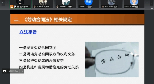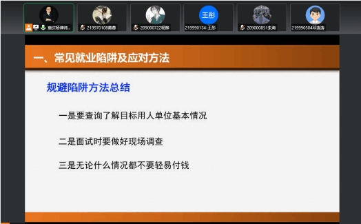 在疫情封控的情况下开展的本次讲座,为学生们打了一剂提防针,在实习就业过程中要警惕陷阱,提高意思,筑牢安全防线。