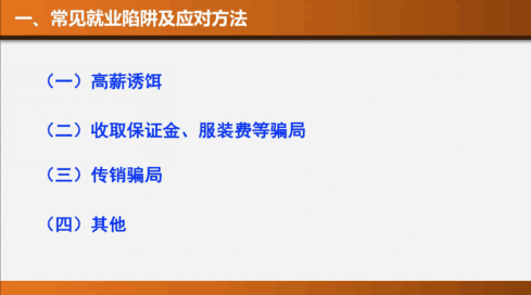 杨律师首先讲了常见的就业陷阱及应对方法,如:高薪诱饵,收取保证金、服装费等骗局,传销骗局等。对于高薪诱饵,不能抱有不切实际的幻想;如果确定被骗,要第一时间报警。应对收取保证金及服装费等情况,一定要注意面试的地点,拒绝向招聘单位交费。对于传销骗局,识别传销能力,有防备警惕心理。同时提防假招聘、真广告,夸大岗位宣传,骗取个人信息、利用试用期骗取廉价人力的情况。