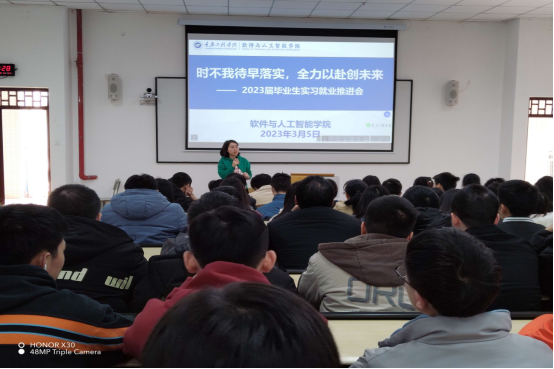 (文/图 软件与人工智能学院 张庆)3月5日,软件与人工智能学院组织2023届毕业生实习就业推进会,学院党总支刘子菱书记为200余在校毕业生开展了“时不我待早落实,全力以赴创未来”就业指导讲座。
