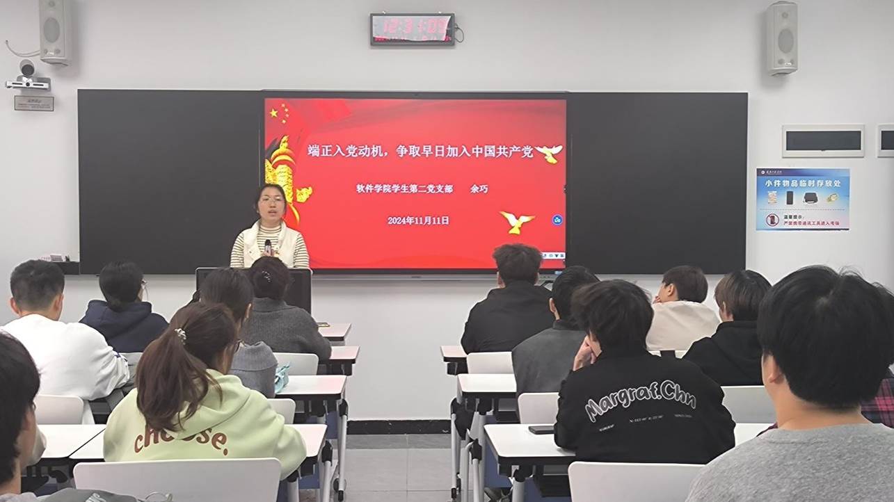 本网讯(图/ 软件学院 任秋)为了帮助支部同志们进一步明确入党的初衷,深化对中国共产党的认识和理解,软件学院学生第二党支部于1111日在7608教室开展“端正入党动机,争取早日加入中国共产党”主题党课。此次党课由软件学院学生第二党支部书记余巧主讲,全体23级入党申请人、积极分子共计50余人参加。