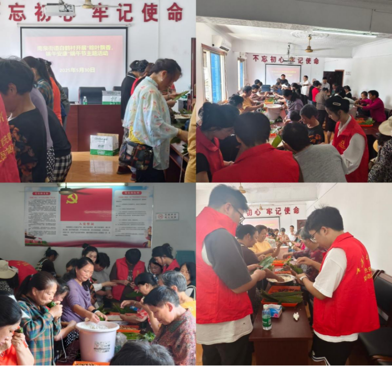 文艺演出结束后,包粽子环节成为全场焦点。大家围坐在桌前,卷起粽叶、填入糯米、压实馅料、扎紧粽绳,一双双巧手翻飞间,形态各异的粽子逐渐成形。环节之余,双方还进行DIY游戏互动,现场不时传来欢声笑语,村民与志愿者交流频繁,分享喜悦,在这个过程中沉浸式感受传统文化的魅力。