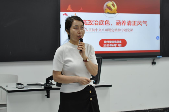 (图/文 软件学院 孟丽娟/唐园)2025年6月11日,软件学院党总支组织全体师生党员开展深入贯彻中央八项规定精神专题教育,党总支书记刘子菱讲授《擦亮政治底色,涵养清正风气》专题党课,全体党员集中观看专题教育片,将理论学习和案例警示相结合,筑牢纪律防线。