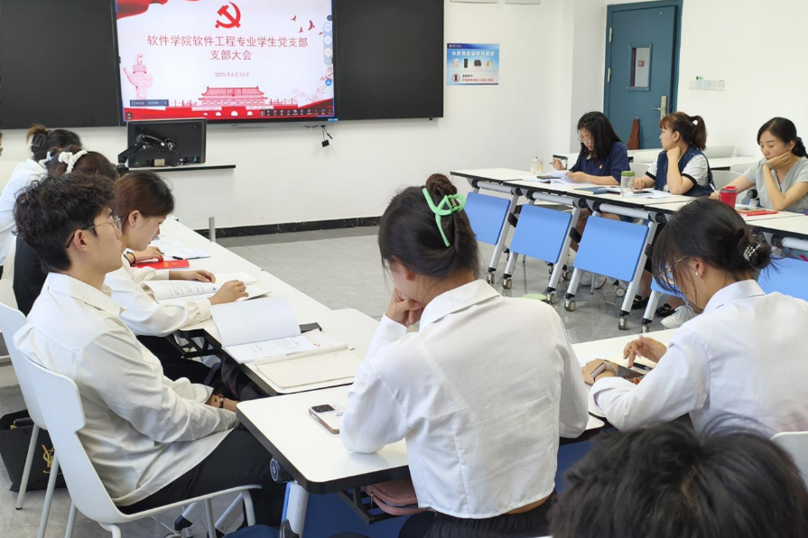 (文/图 软件学院 潘俊宇/谭毅)2025年6月13日,软件学院软件工程专业学生党支部在第七教学楼610教室召开支部大会,讨论吸收令狐晓桐等12名同志为预备党员相关事宜。本次大会由支部书记王薇同志主持,支部全体党员和预备党员共54人参与。