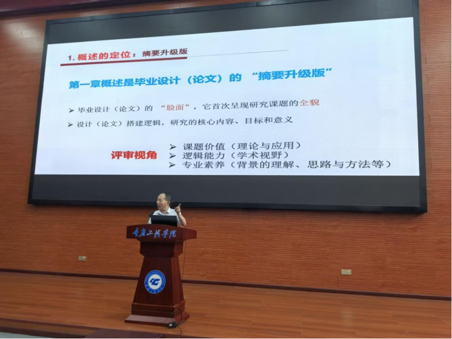 李中学教授深入讲解了概述部分的写作逻辑,指出论文概述实质上是“摘要的扩展与深化”。他提出概述应清晰界定课题功能定位,其内容应包含研究背景(行业痛点与政策需求)、目的与意义(理论/实践价值)、国内外研究现状综述(评述现有成果与不足)、论文结构(章节内容与逻辑关系)四个部分。他还针对学院近年毕设论文抽检中发现的概述部分的典型问题做了剖析与讲解,并给出了针对性改进策略,要求老师们紧扣课题精准检索文献,对比分析突出创新点,技术描述具体到工具版本。