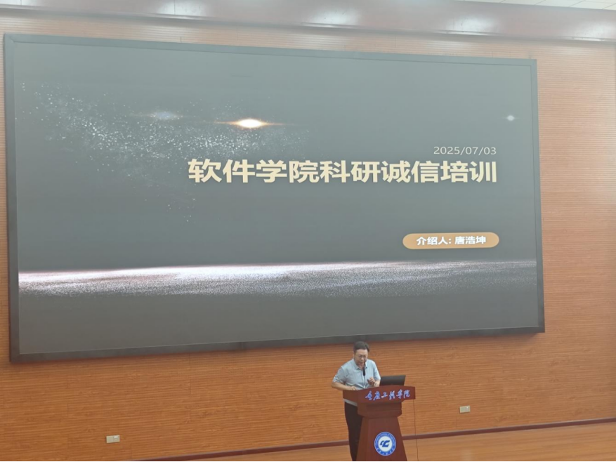 (文/图 软件学院 唐浩坤)为深入贯彻落实国家关于加强科研作风建设的部署要求,切实响应学校科技处关于开展科研领域不良作风专项治理的号召,7月5日下午,软件学院在7807学术报告厅召开科研诚信专题培训会暨毕业设计指导能力提升首场培训。学院科研副院长唐浩坤作专题报告,全体教师参会。