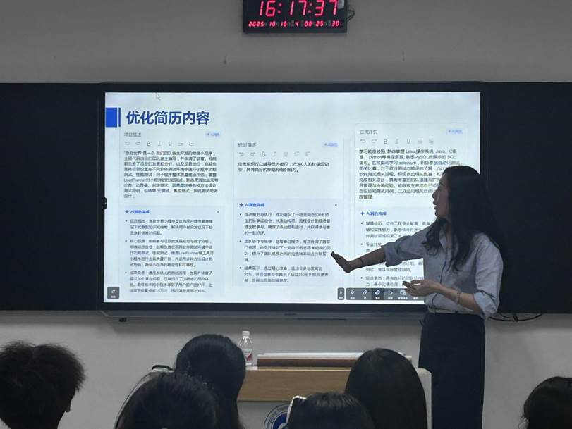 (图/文 软件学院 高一帆)为帮助学生应对就业市场竞争,解决求职过程中的各类难题,助力学生实现从校园到社会的顺利过渡,提升综合就业竞争力,星火燎原辅导员工作室于 2025 年 10 月 16 日 16:00,在南泉校区第六教学楼 6121 举办 “职引未来,扬帆起航” 专题讲座,软件学院全体同学(南泉校区)参与此次活动。