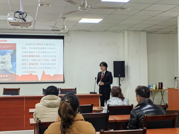 活动现场,宣讲团成员以中国共产党人精神谱系为核心主线,用“理论+故事”的形式展开宣讲。他们首先围绕建党精神的核心内涵,从“坚持真理、坚守理想”到“践行初心、担当使命”,把抽象的精神理念转化为具象的生活表达,助力村民读懂党的精神源头。在红色故事分享环节,成员们生动讲述了抗疫精神中逆行者的担当故事,从医护人员到基层志愿者的感人事迹,让村民真切感受到“生命至上、举国同心、舍生忘死、尊重科学、命运与共”的精神力量;随后回望抗美援朝战场,通过“冰雕连”等震撼人心的史实,诠释了保家卫国的钢铁意志。真挚的情感、鲜活的案例引发在场村民的共鸣,现场不时响起阵阵掌声。
