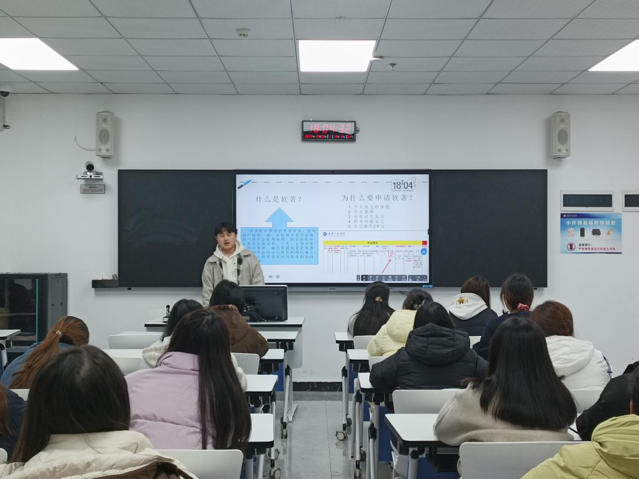 活动中,主讲人廖梓臣从基础认知到实操落地展开高效分享。他先明确软件著作权的法律定义与核心价值,强调其在学分置换、学业评优、职业技能鉴定中的关键作用,解读自动保护原则与独创性要求。随后聚焦申请全流程,演示中国版权保护中心实名认证要点,拆解合作开发协议书、源代码等四大核心材料的准备规范,梳理“注册填报—材料上传—审核发证”的关键节点。针对材料格式错误、源程序量不足等常见问题,他结合案例给出整改方向,分享实用避坑技巧。互动环节,同学们围绕协议签订、补正材料提交等疑问积极提问,现场答疑氛围热烈。