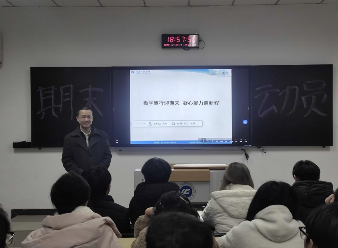 班导会伊始,吴涛老师首先强调了期末复习的重要性,并围绕“科学备考、诚信应考、全面过关”的主题,向同学们提出三点具体建议:一是要明确每门课程的复习范围,在理解的基础上系统记忆,避免盲目泛化;二是考试中应保持卷面完整,即使遇到难题也要尽量书写相关知识点,做到“不留空白”;三是鼓励大家树立信心,争取每门课程顺利通过,以优异的成绩迎接新春佳节。