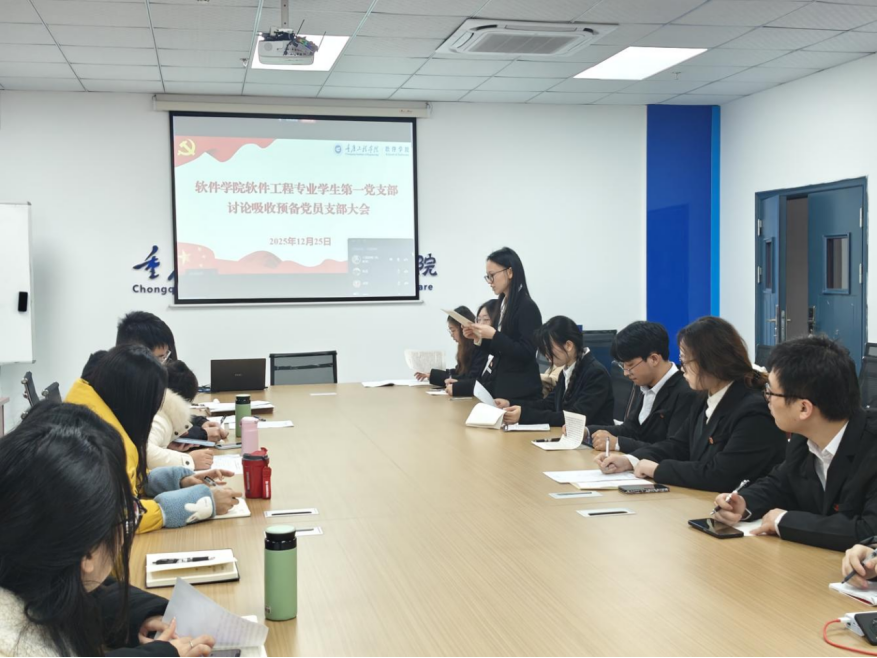 (文/图 软件学院 陈代玉)软件学院软件工程专业学生第一党支部于12月25日在7506会议室召开讨论吸收向海等6位同志为中共预备党员支部大会。会议由支部书记王薇同志主持,全体党员、预备党员共同参加。