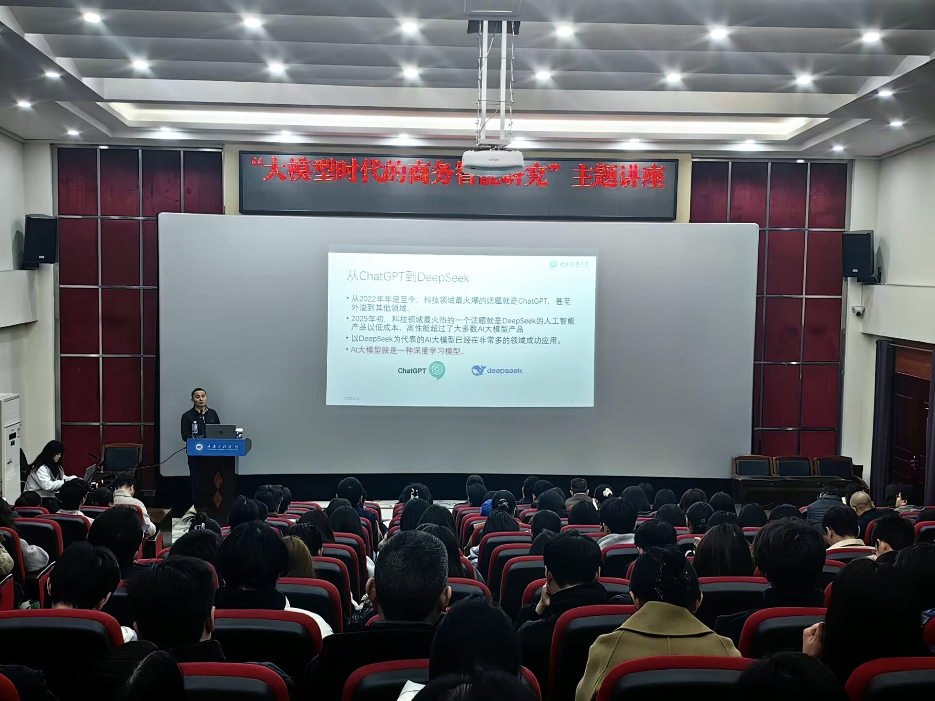 本网讯 (文/图 大学生科研创新服务中心 赵樱颖)为进一步浓厚我校学术氛围,3月21日,科技处邀请西南财经大学计算机与人工智能学院教授、西南财经大学“光华百人计划”学者、第十二批四川省学术和技术带头人后备人选邱江涛博士来校进行“大模型时代的商务智能研究”主题讲座。大数据与人工智能学院、管理学院、新媒体电商学院部分师生参加讲座。