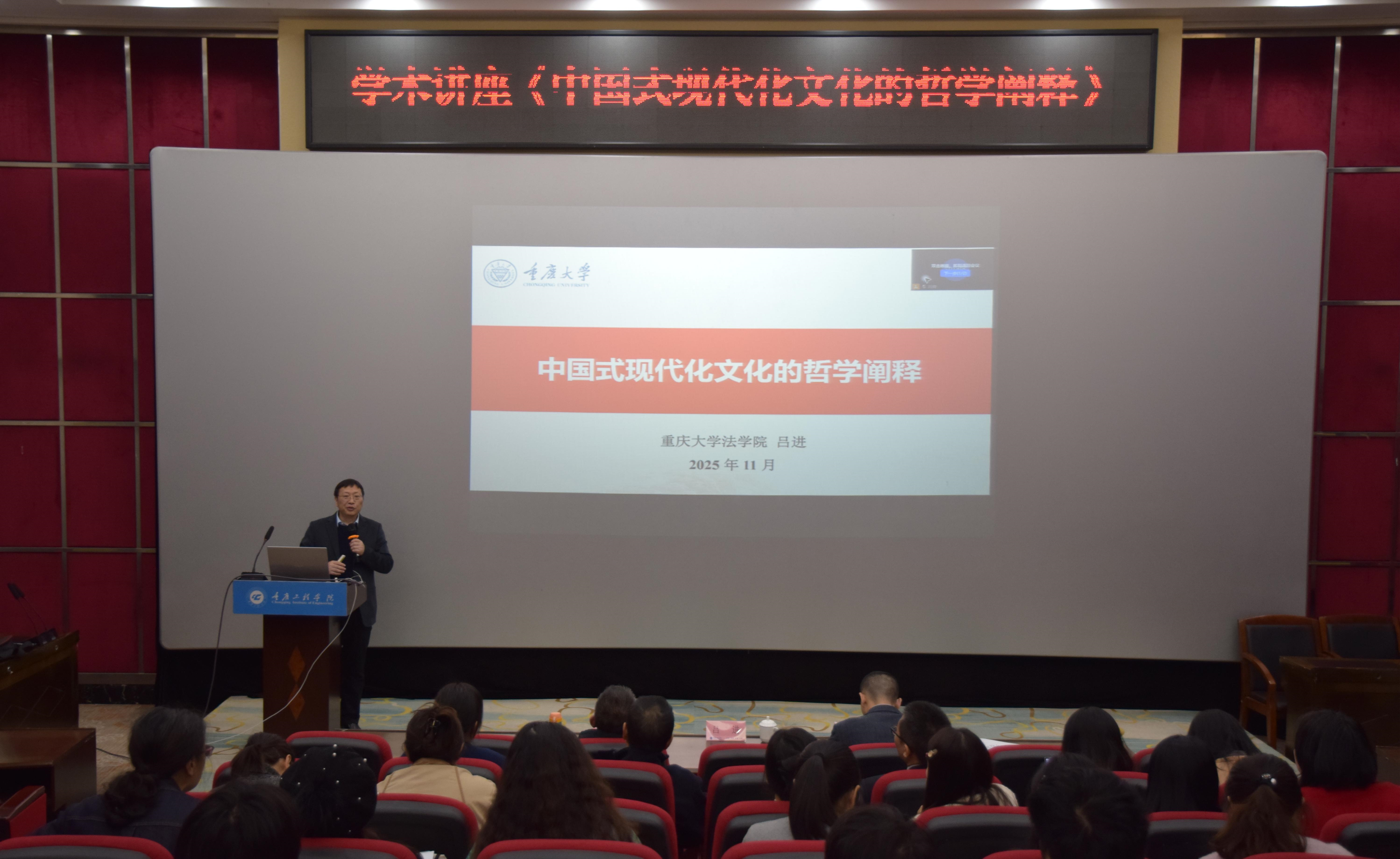 本网讯(文/马克思主义学院 刘爽、科技处 李世毅 图/大学生记者团)为营造浓厚学术氛围,搭建青年教师交流平台,分享科研实操经验,学校于11月12日下午,在办公楼报告厅开展“中国式现代化文化的哲学阐释”学术讲座。本次讲座特别邀请重庆大学法学院教授、博士生导师、法学博士、哲学博士、厦门大学哲学流动站出站博士后、美国哥伦比亚大学访问学者吕进教授主讲,科技处、宣传部负责人,马克思主义学院全体教师、以及其他感兴趣的师生共计100余人参加。讲座由马克思主义学院副院长王巧玲主持。