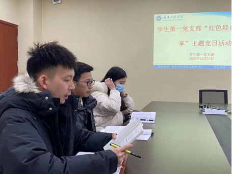 引导发扬党的精神,传承党的文化,更深层次地了解党,靠近党,敬仰党2022年121416时,中共重庆工程学院双桥校区管委会学生第一支部统一组织“红色经典诵读分享”主题党日活动