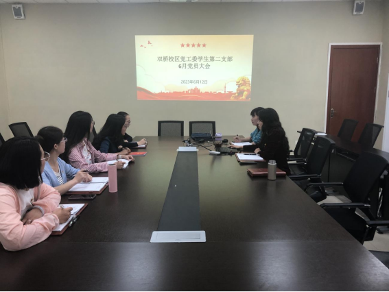 本网讯(文/图 黄天桥)为深入学习贯彻党的二十大精神,增强基层党组织的创造力、凝聚力、战斗力,发挥先进典型的示范带动作用,激励基层党组织和党员坚定信念、履职尽责、奋发有为,2023年6月12日上午10:00,双桥校区学生第二党支部在办公楼202会议室组织开展6月党员大会,大会内容为讨论2022年度学校基层党组织和党员“两优一先”推荐人员。主持人为双桥校区学生第二党支部书记李小凤。