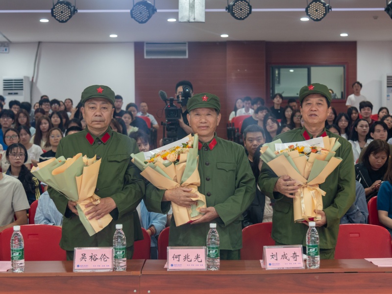 活动伊始,主持人隆重介绍了何兆光、刘成奇和吴裕伦三位老兵同志。随后,优秀学生代表向三位老兵同志献上鲜花,表达对英雄们的崇高敬意。