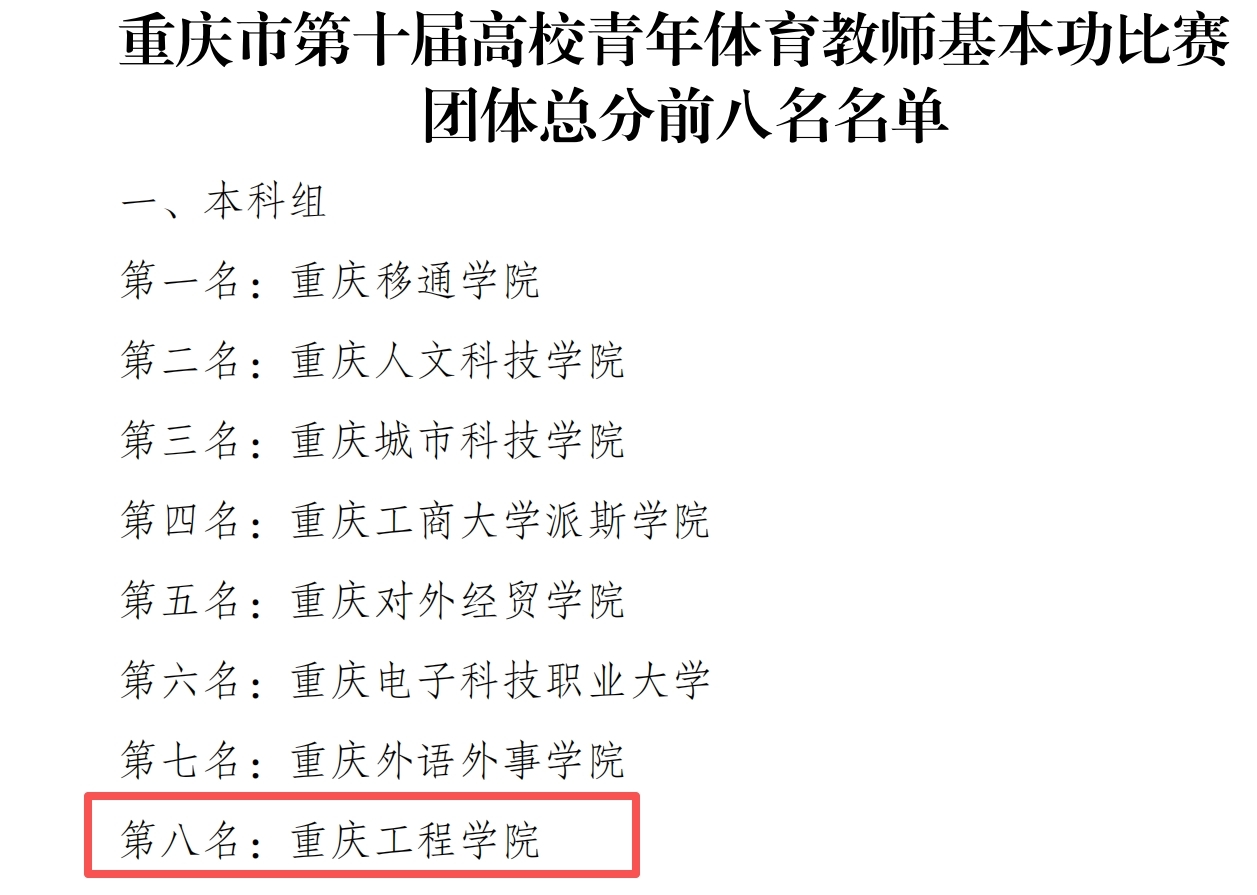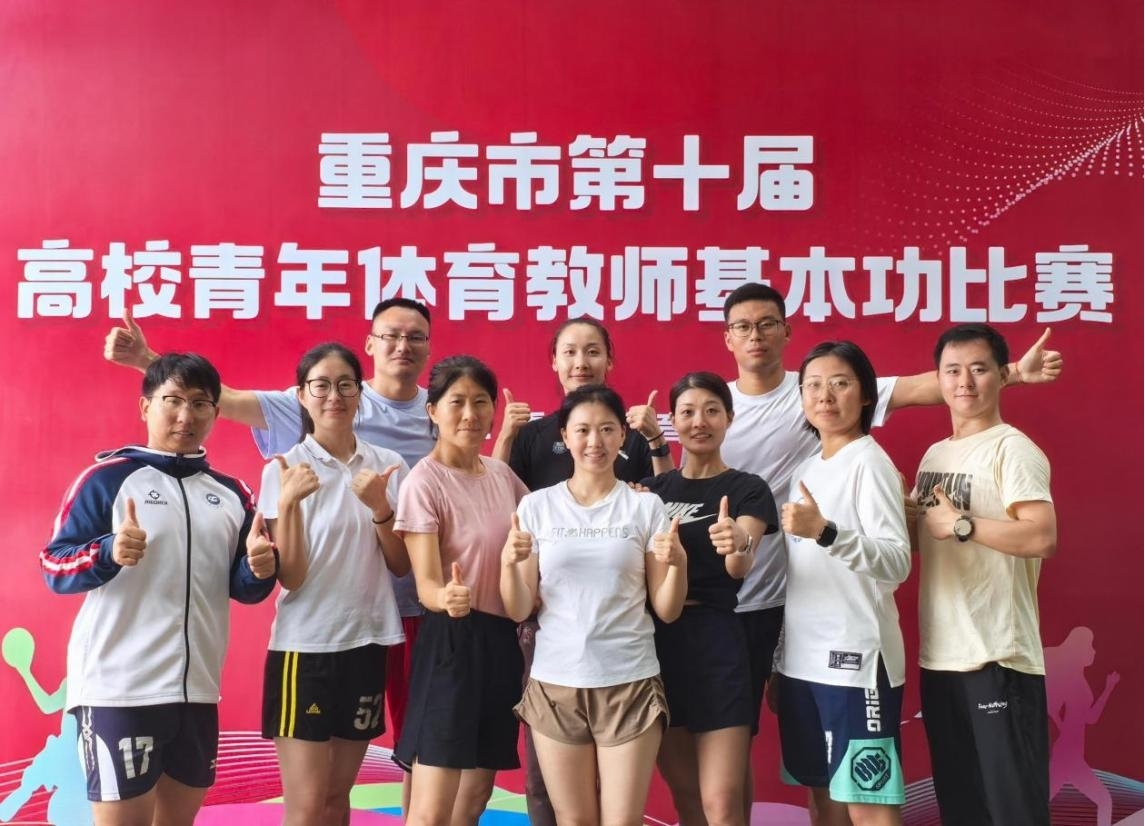 2025年9月28日,由重庆市教育委员会主办的重庆市第十届高校青年体育教师基本功比赛在西南政法大学落下帷幕。经过三天的激烈角逐,我校代表队荣获团体总分第八名。高丰和马艳分别斩获一等奖,王思琪、杨震和黄馨分别荣获二等奖,敖丽、宋一帆、李鹏飞和王永莲分别获得三等奖。其中,马艳在本科组-篮球(女)项目总得分为全市第一名。